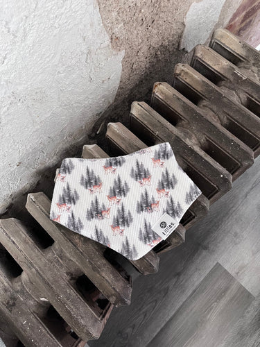 The sweetest bib featuring a mama deer with her baby fawn surrounded by pine trees.