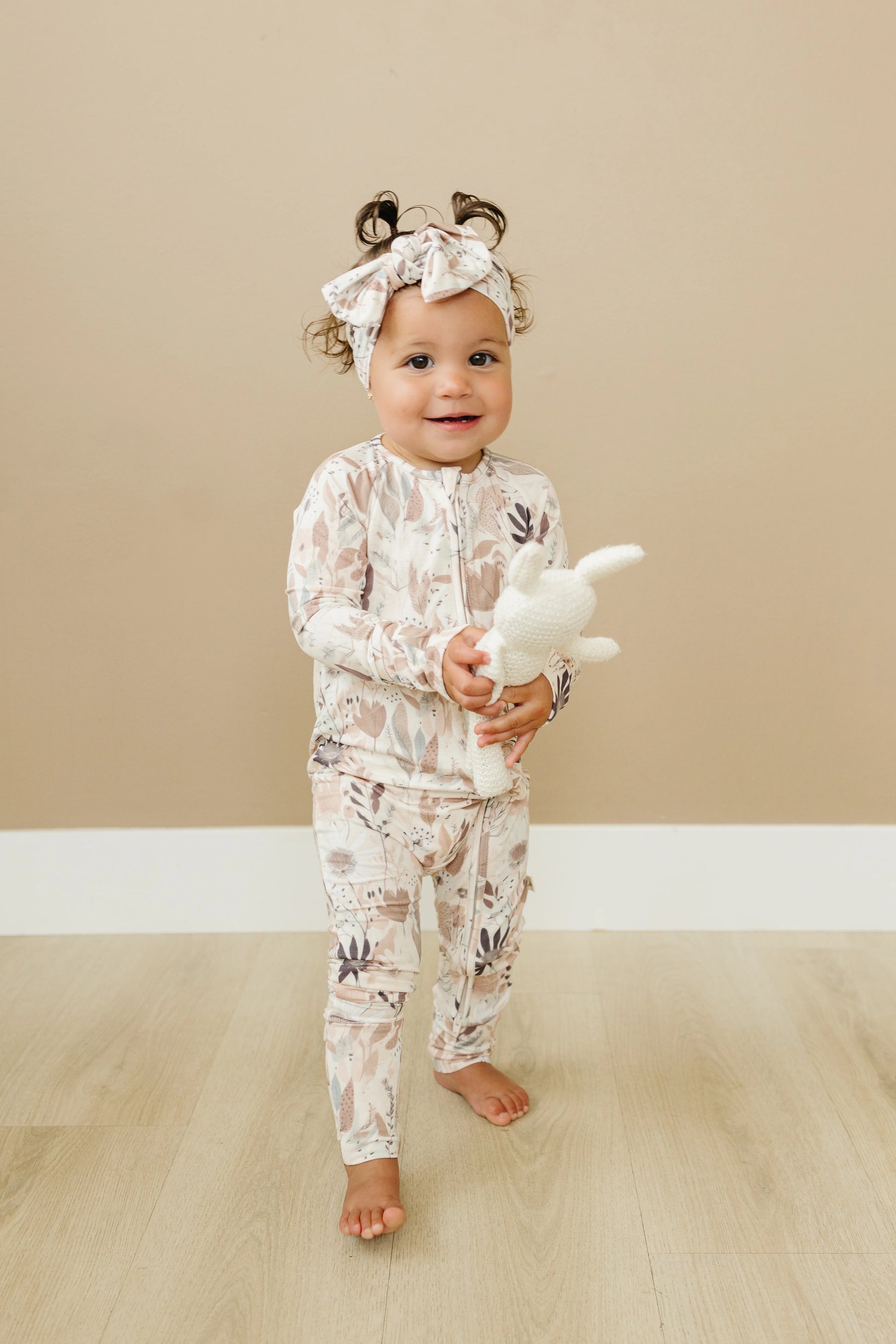 Introduce your little one to the Rue—a bamboo sleeper that wraps them in softness and style. Featuring hand-illustrated wildflowers in warm earth tones, this footie celebrates nature's gentle beauty in a vintage boho design. Crafted from buttery bamboo viscose, it's breathable and stretchy for year-round comfort, while the two-way zipper makes nighttime changes effortless. Fold-over cuffs keep tiny hands and feet cozy, and the tagless construction means nothing interrupts their peaceful sleep. Perfect for the free-spirited child who deserves comfort as kind as their spirit.
