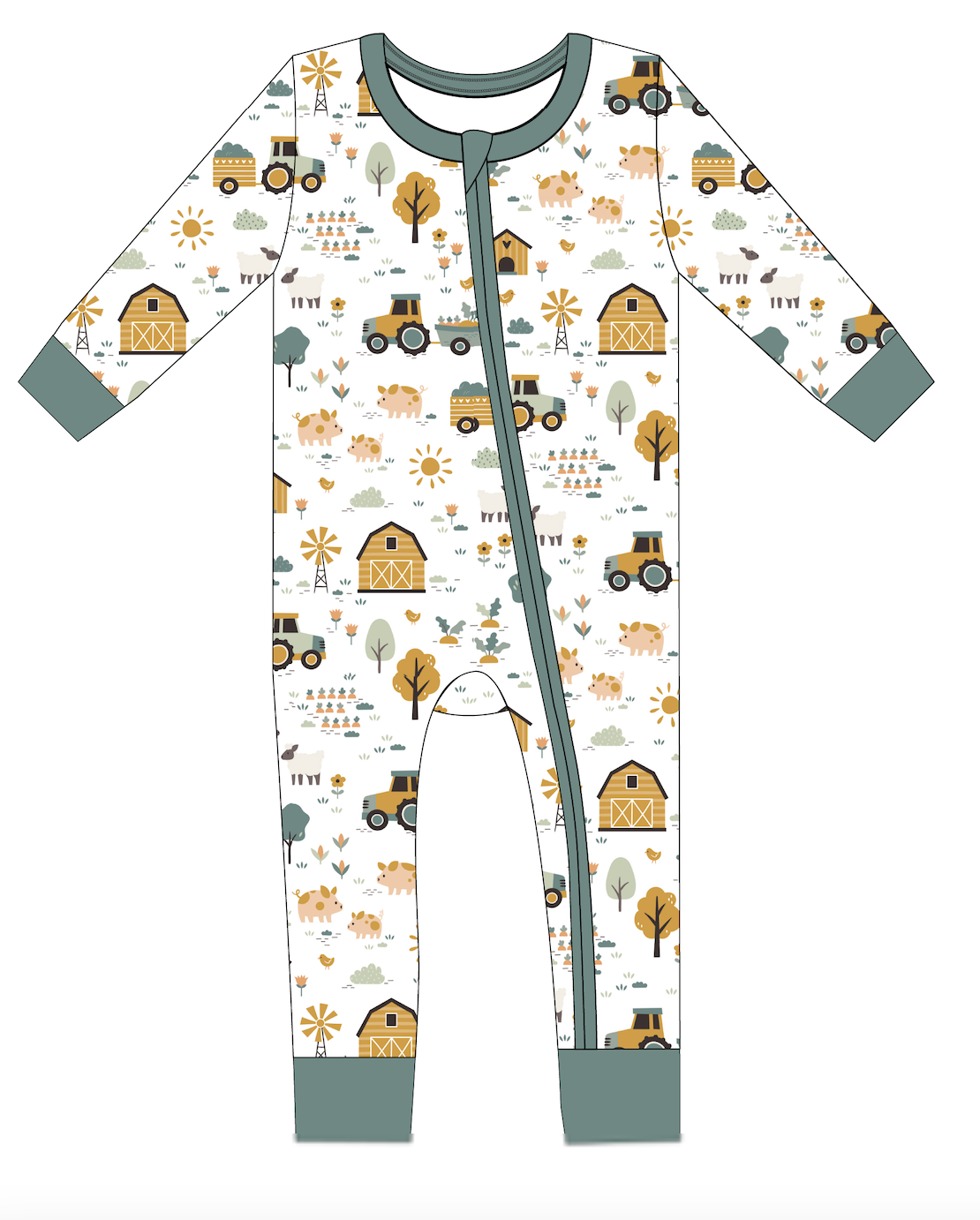 Sawyer Farm Friends — E-I-E-I-O! Farmer Sawyer is here to harvest his farm crops and tend to his pigs and chickens. This gender-neutral farm print is sure to be a hit with all little farmers. WHY BIRD & BEAN? Made from the highest quality, extra soft bamboo fabric, our baby pajamas + kid's pajamas are a hit! Our bamboo pajamas are made with our buttery soft bamboo/spandex blend with the perfect amount of stretch + softness. Plus, we make our fabric slightly heavier weight to make our pieces last. Our fabric will hold its shape, color, + quality wash after wash. Please read our many reviews from happy customers!