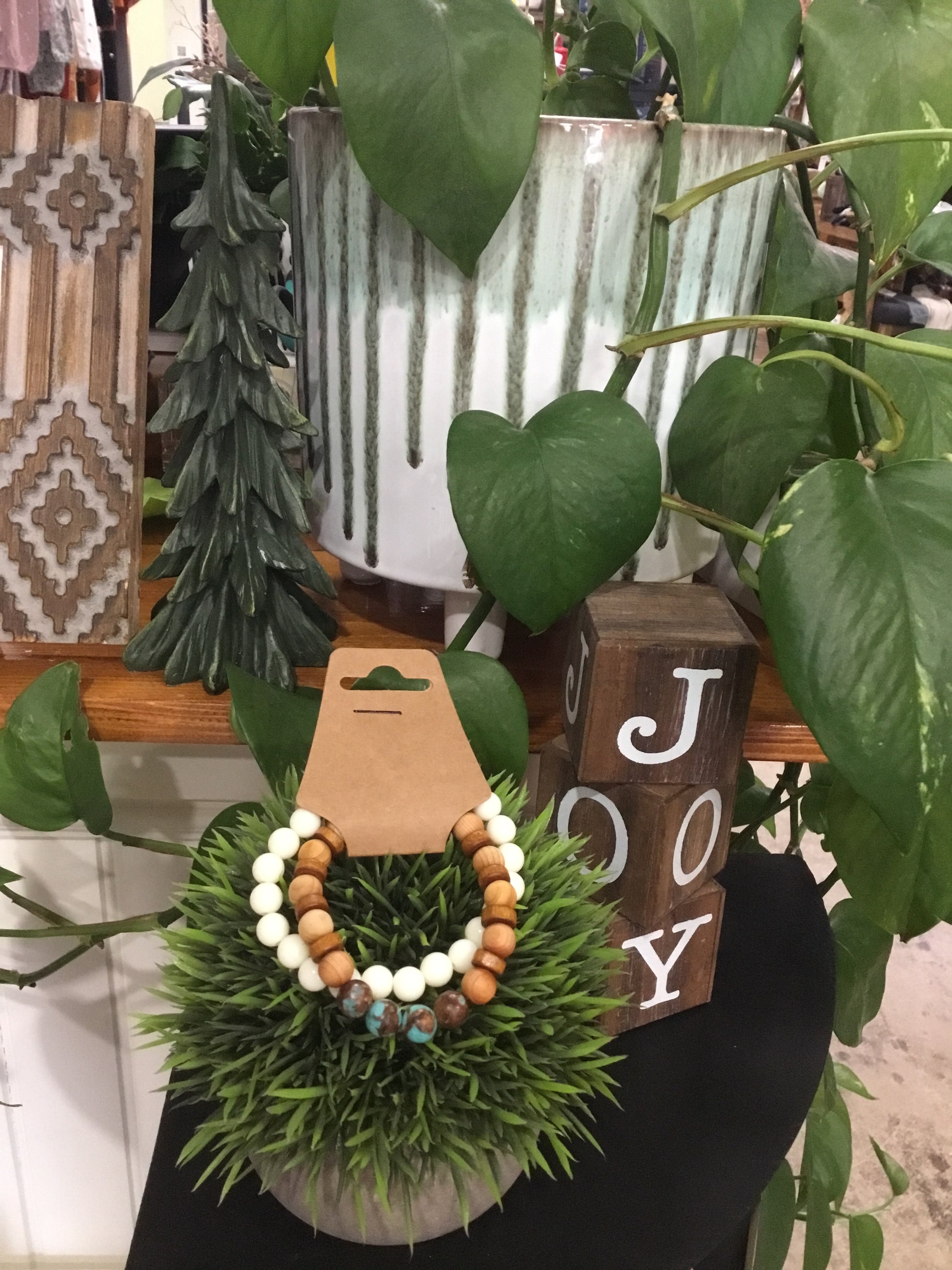 The cutest ivory, wood, and turquoise bead set that can pair with other bracelets to complete the perfect set.