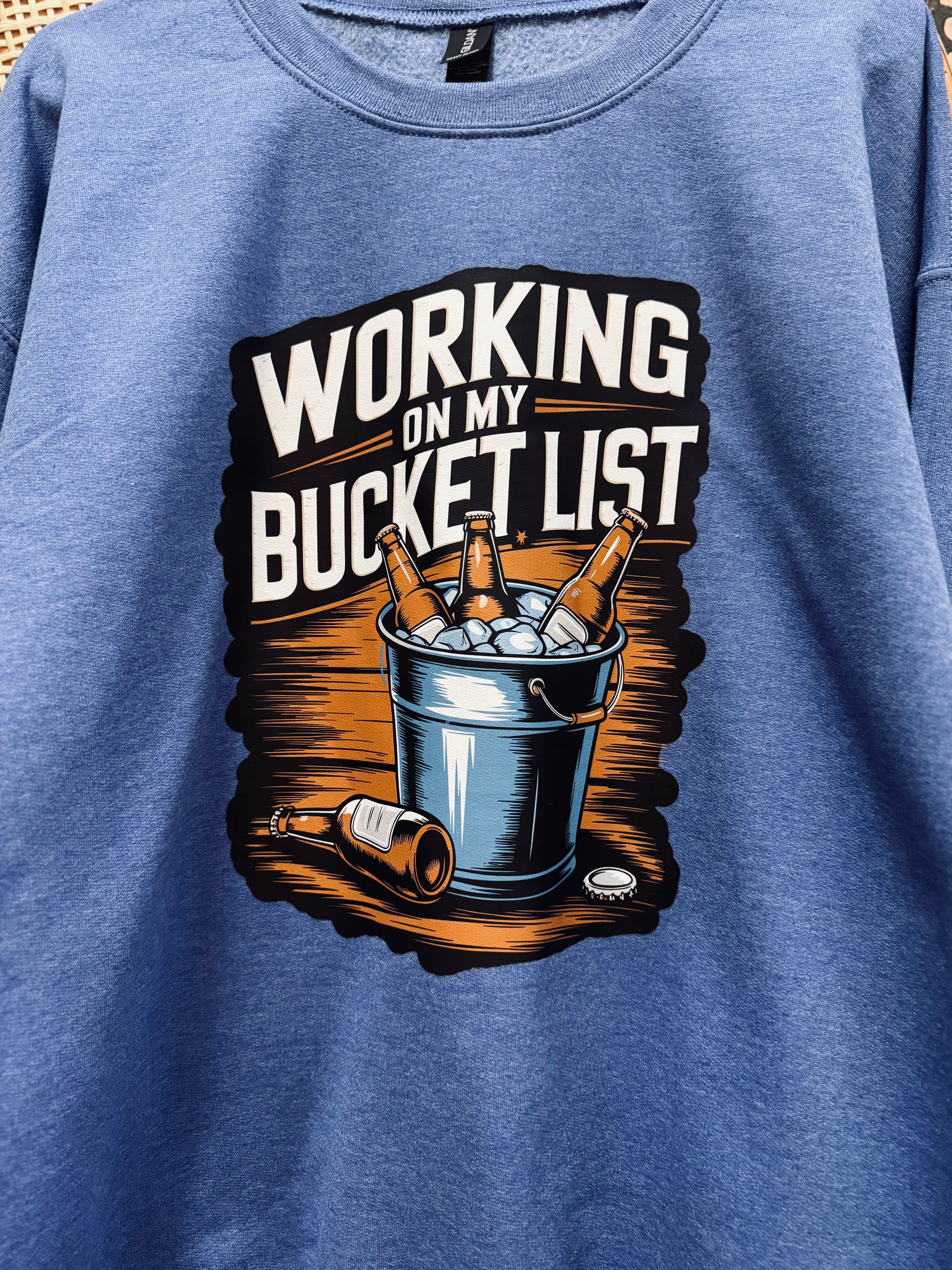 The product is pressed in-house on a Gildan Brand sweatshirt in Heather Deep Royal color that comes in a unisex size. It features a screen print transfer with the phrase 'working on my bucket list', which cleverly references a bucket of adult beverages. To maintain the quality of the print, avoid direct heat and wash the sweatshirt inside out.