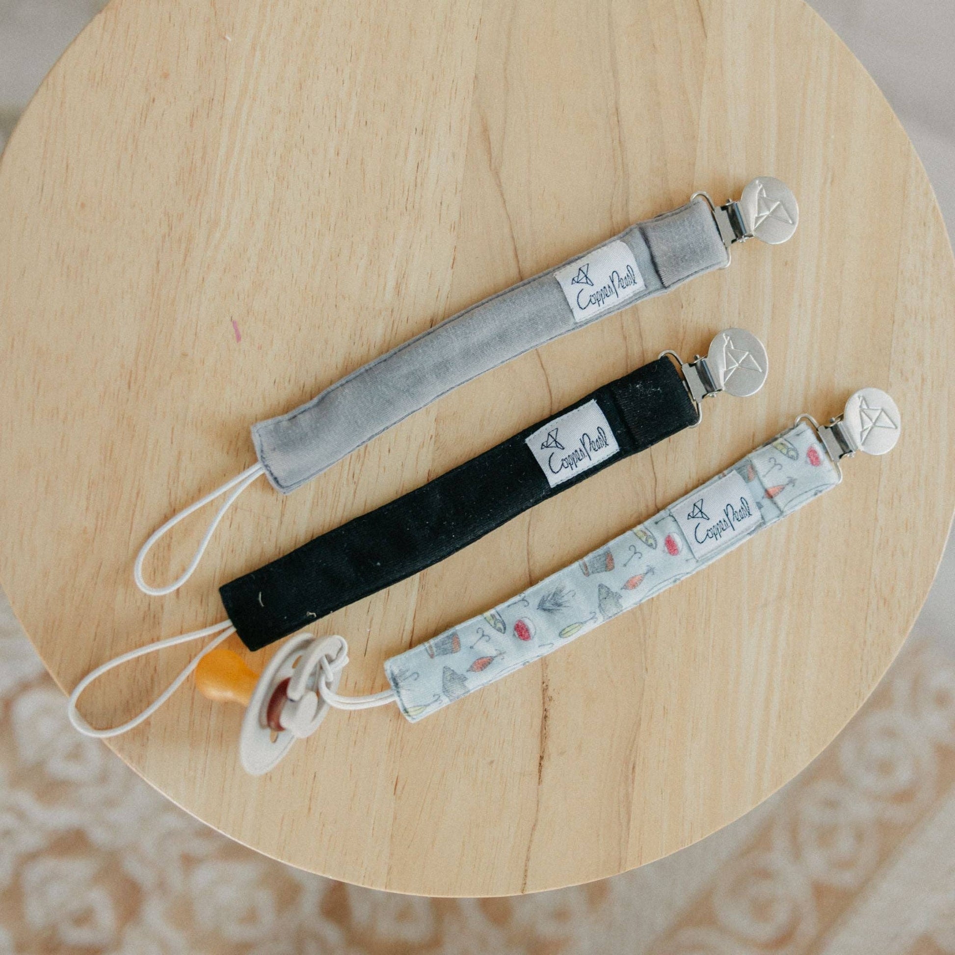 The secure stainless steel attachment works with pacifiers, teethers, and baby gear—eliminating those frustrating moments when pacifiers hit the floor. This three-clip set ensures you're always prepared, whether at home, in the car, or on the go. Practical, fashionable, and built to last.