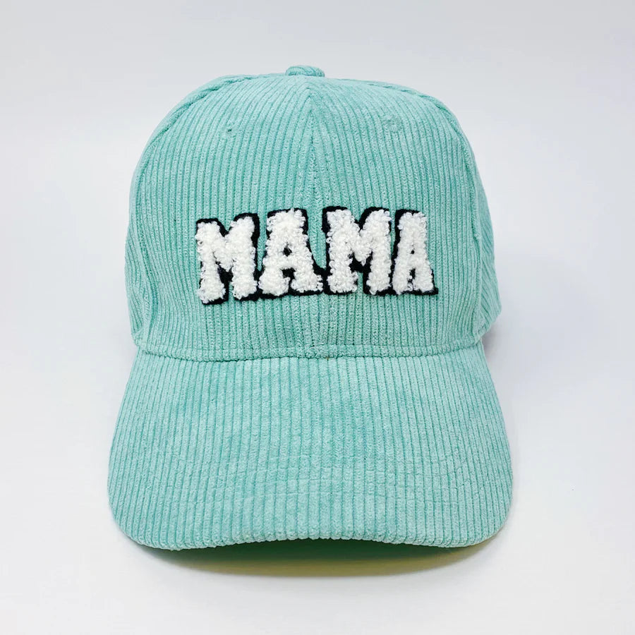 Adorable corduroy MAMA ball cap with fuzzy patch lettering! Has great fit with perfect curved brim. Clip closure on the back to adjust size and hidden pocket for seamless look. Great details all around.