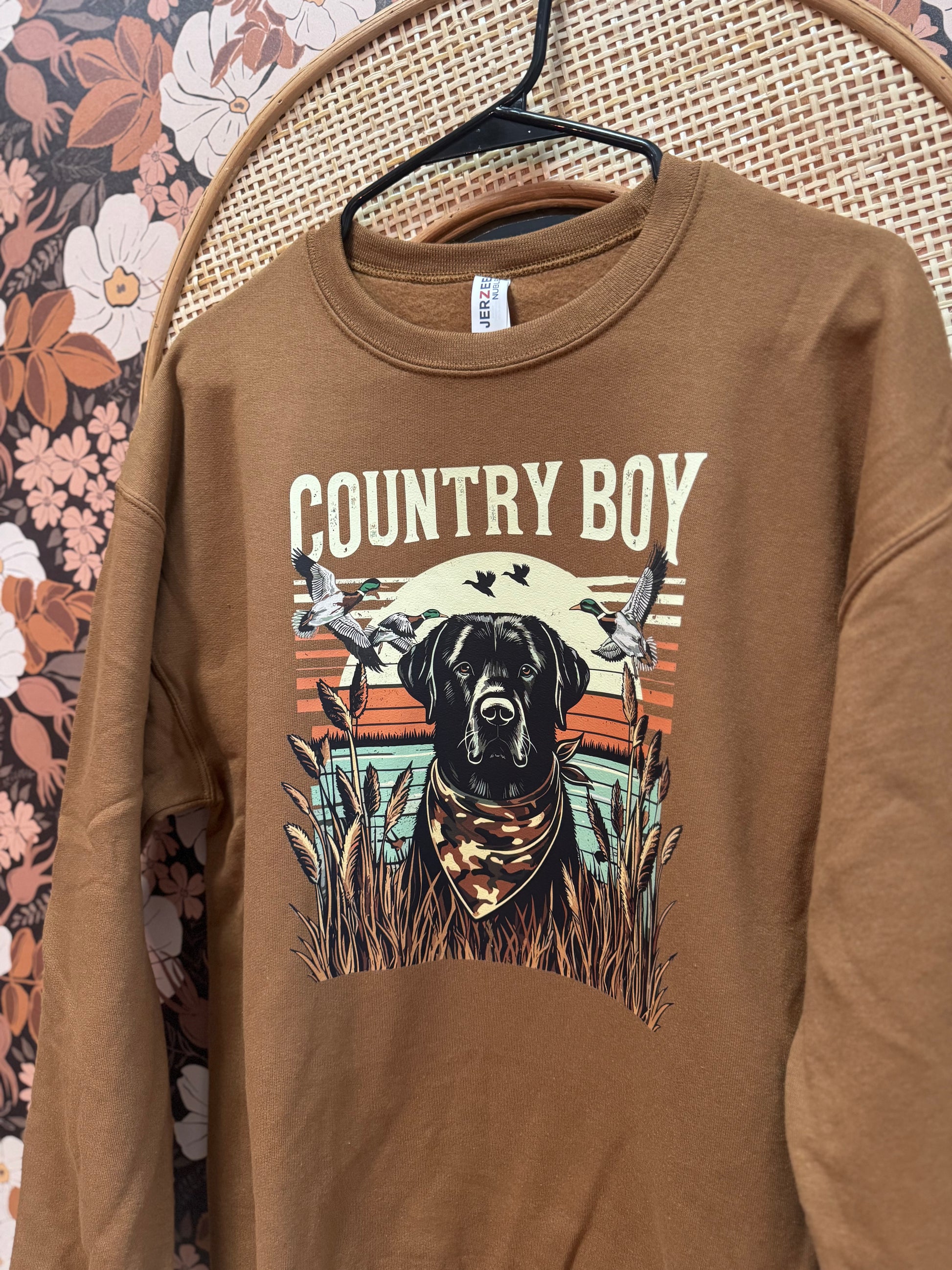 Expertly crafted from a blend of 50% cotton and 50% polyester, this Country Boy Sweatshirt pressed on a Jerzees Brand offers a comfortable and durable option for your wardrobe. The camel color and screen print transfer, pressed in-house, add a touch of style. With its unisex fit, this fleece crew will become a go-to choice for any casual occasion.