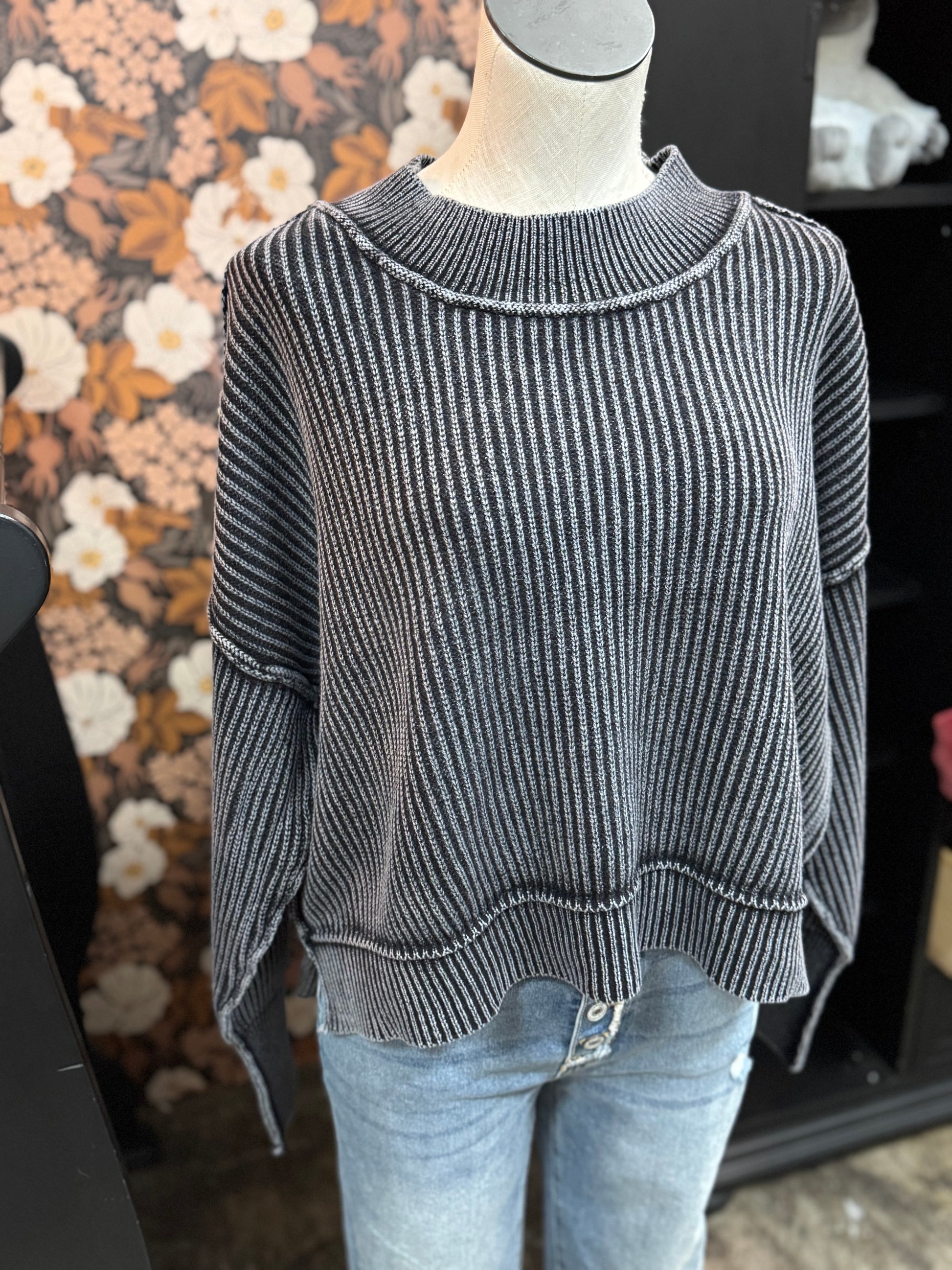 This washed black cropped sweater features an oversized fit with elegant side slits, offering both comfort and a modern silhouette. Crafted to provide effortless layering, it blends casual ease with refined style, making it an essential piece for versatile women's wardrobes.