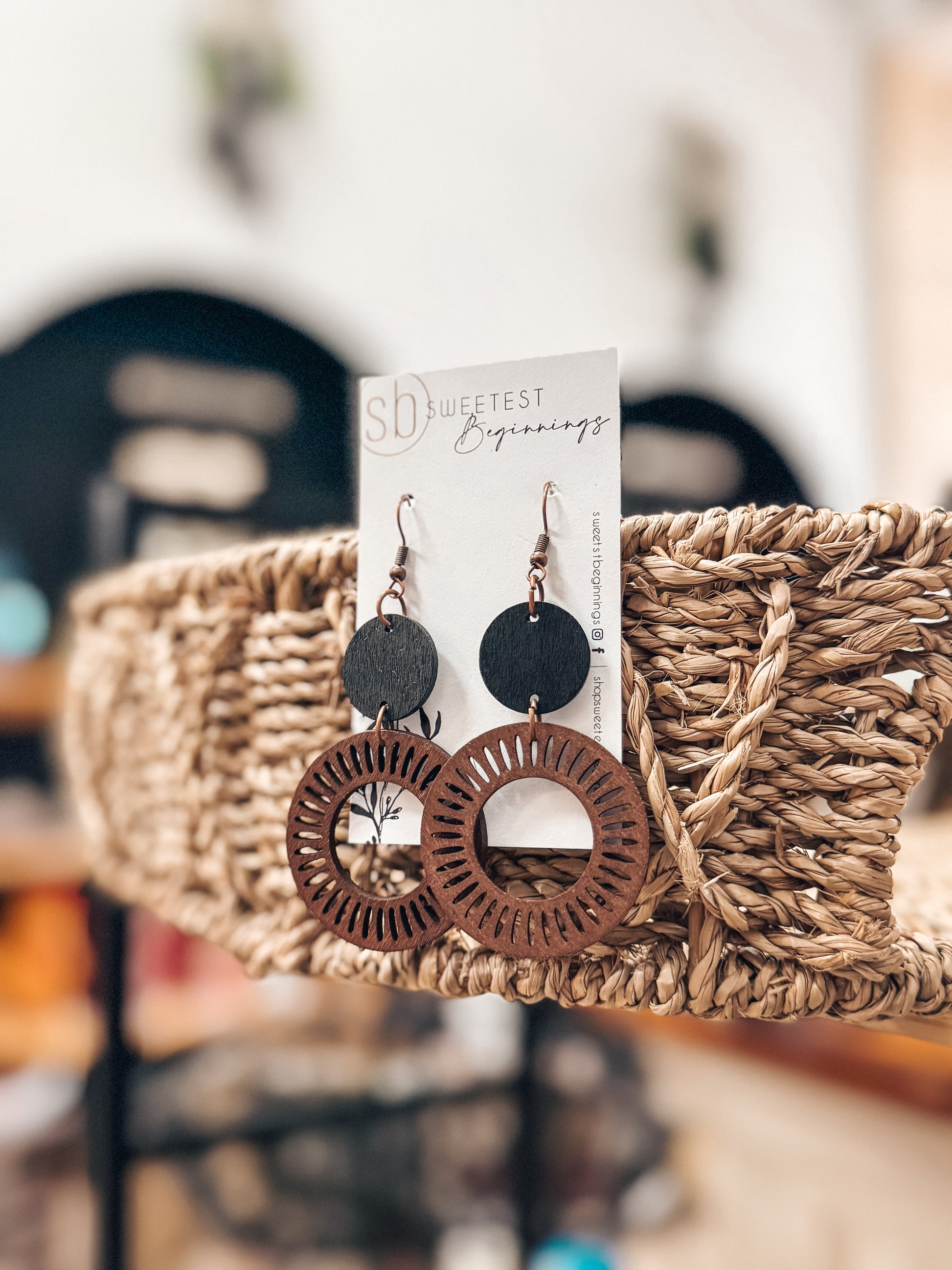 Expertly crafted with a bohemian flair, these dangle earrings feature a unique two-layer design with a circular motif. Their natural tones add a touch of earthy elegance to any outfit.