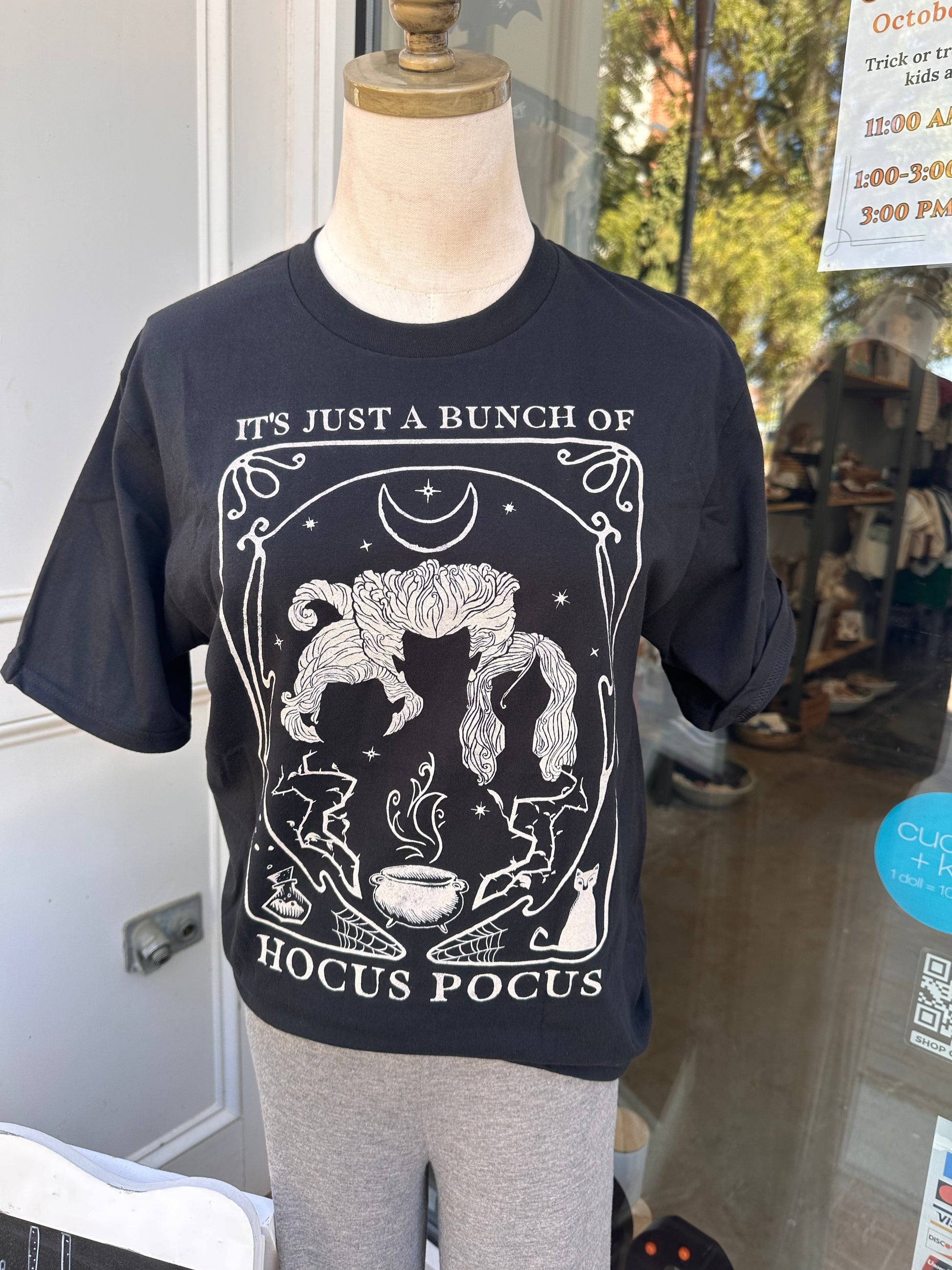 This black, soft fabric tee features a hocus pocus tarot card design, expertly screen printed in white ink. Available in unisex sizing for a comfortable fit.