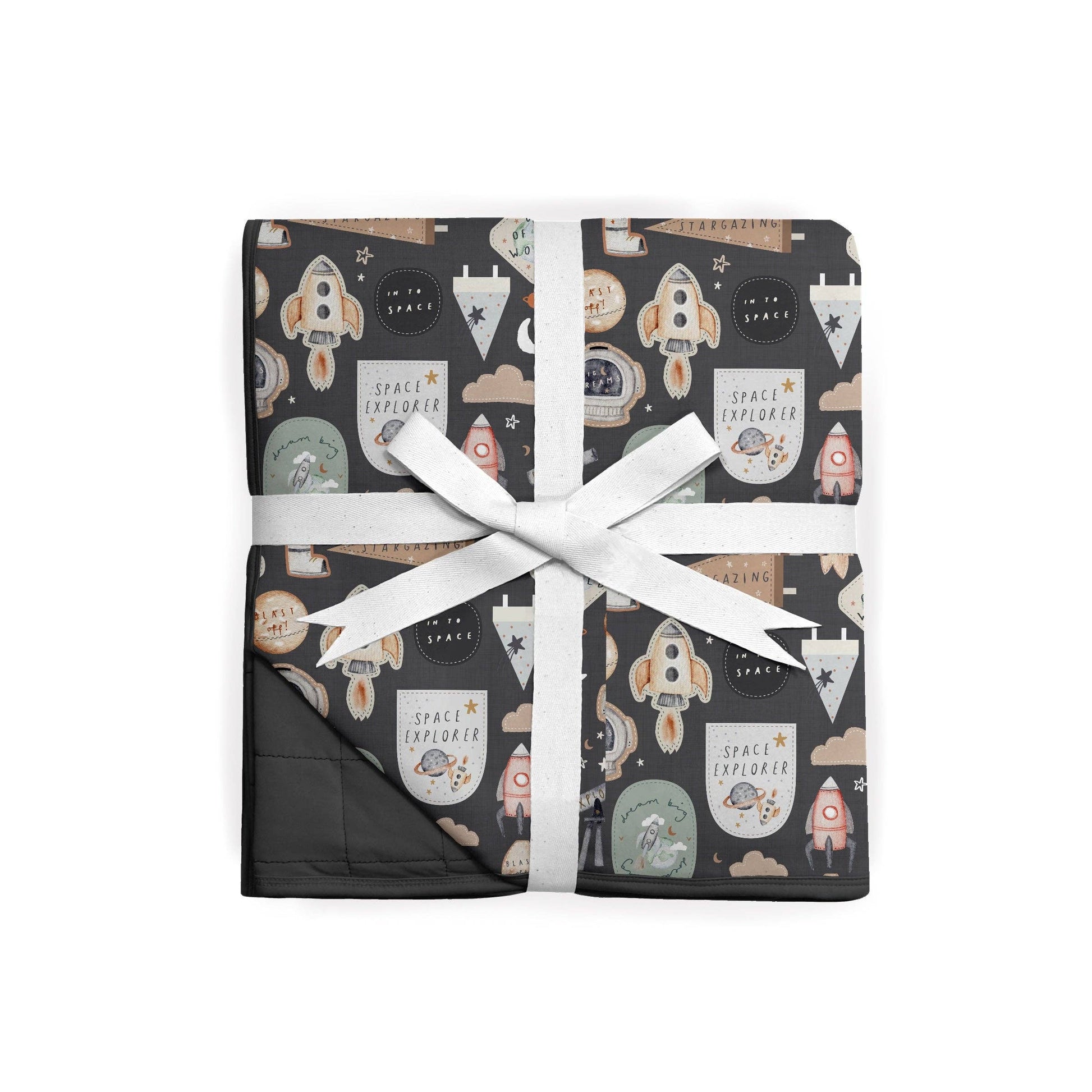 Soar into dreamland with our Out Of This World quilted blanket! Adorned with a delightful galaxy of sparkling stars, dynamic rockets, and cheerful planets, this design is ideal for little adventurers with boundless imaginations. Crafted from our luxurious buttery-soft bamboo, these blankets are breathable, flexible, and incredibly cozy—ensuring your little astronaut remains snug through every journey, from bedtime to beyond!