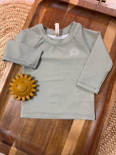 This stylish sage rashguard offers excellent sun protection with UPF 50 fabric. Designed to coordinate seamlessly with our dino swim shorts or summer stripe swim shorts, it combines functionality with fashionable appeal. Crafted from 80% recycled polyester and 20% elastane, it ensures comfort and durability while supporting sustainability.