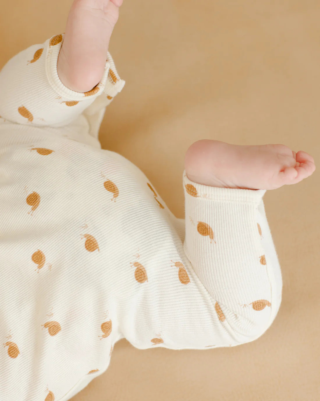 This rib-knit baby jumpsuit offers a slim fit with flexible stretch to accommodate your baby's growth. It features convenient snaps along the inseam and front for effortless diaper changes. The ivory fabric is adorned with an all-over snail print. Crafted from 95% organic cotton and 5% elastane, it is machine washable in cold water and safe for tumble drying on low heat.