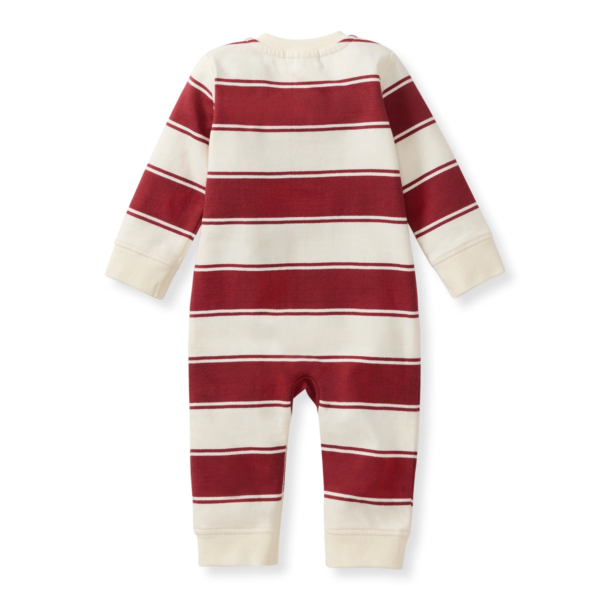 Dress your little one in timeless holiday charm with this rugby stripe jumpsuit. Crafted from 100% organic cotton, it features a classic henley neckline and long sleeves for cozy comfort. The soft fabric is gentle on delicate skin, while functional snap closures at the leg opening make diaper changes effortless. Finished with ribbed cuffs at the sleeves and legs for a polished look, this brick red jumpsuit combines style with everyday practicality—perfect for festive gatherings and everyday wear alike.