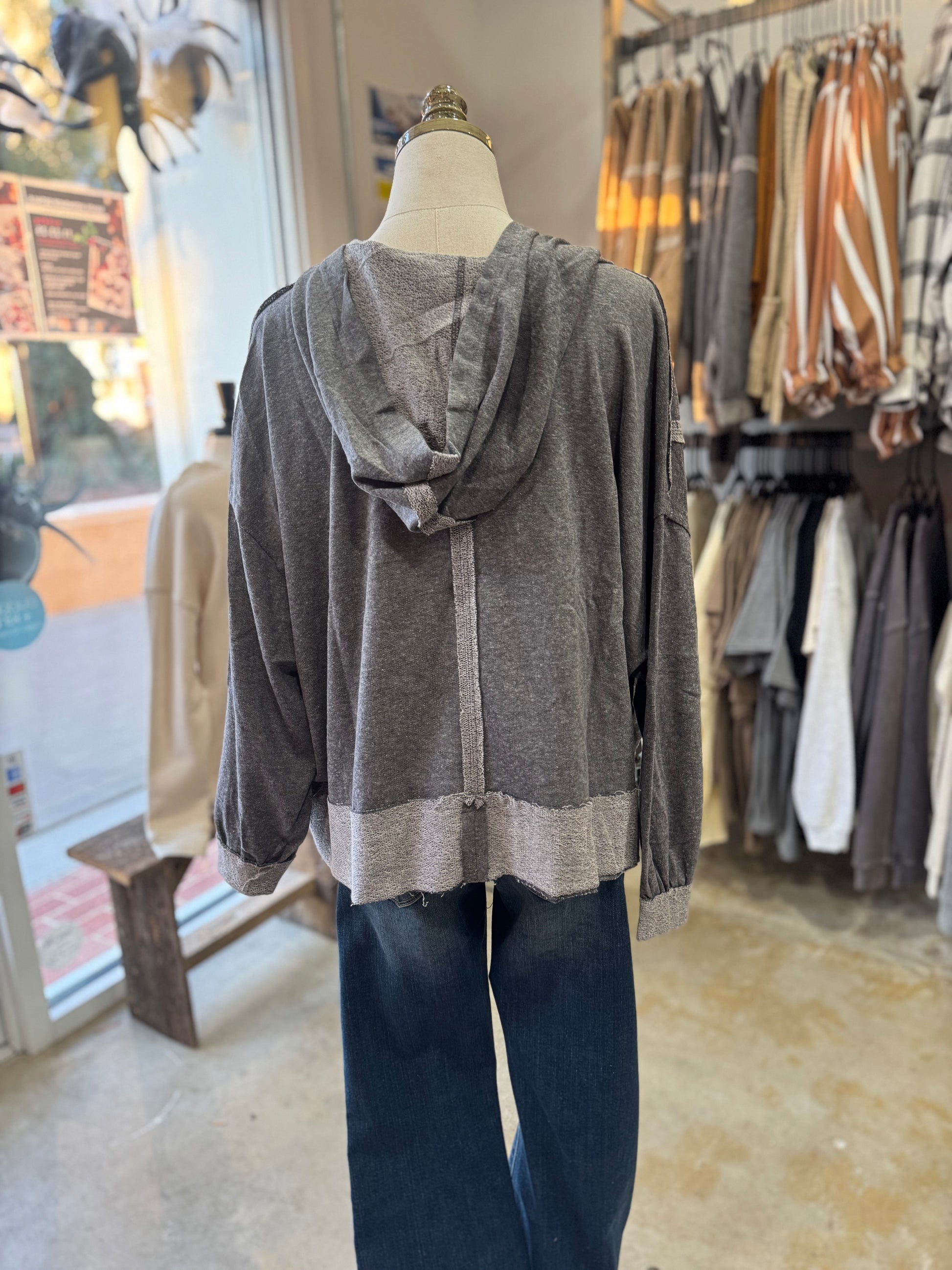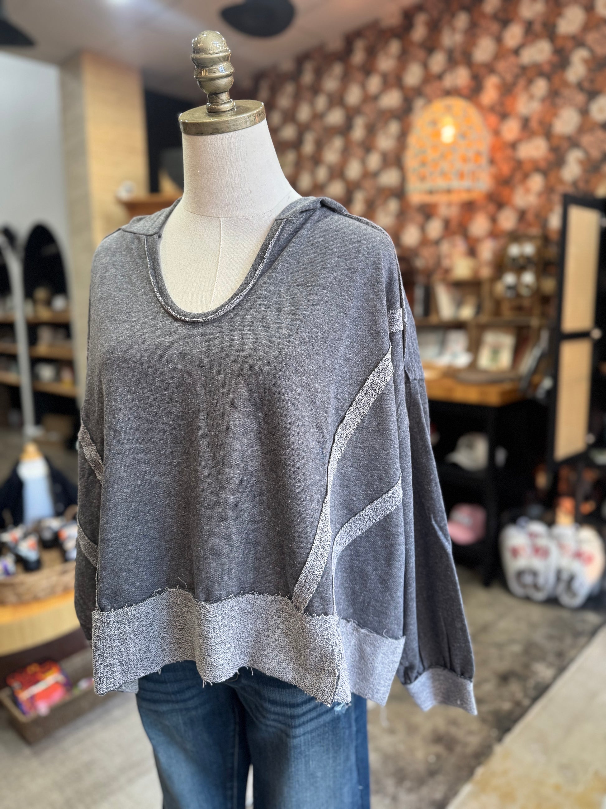 This contrast trim slit raw hoodie features a sophisticated two-toned design that adds subtle visual interest. The flattering V-neckline enhances the silhouette, while the side slits provide ease of movement and a modern touch.