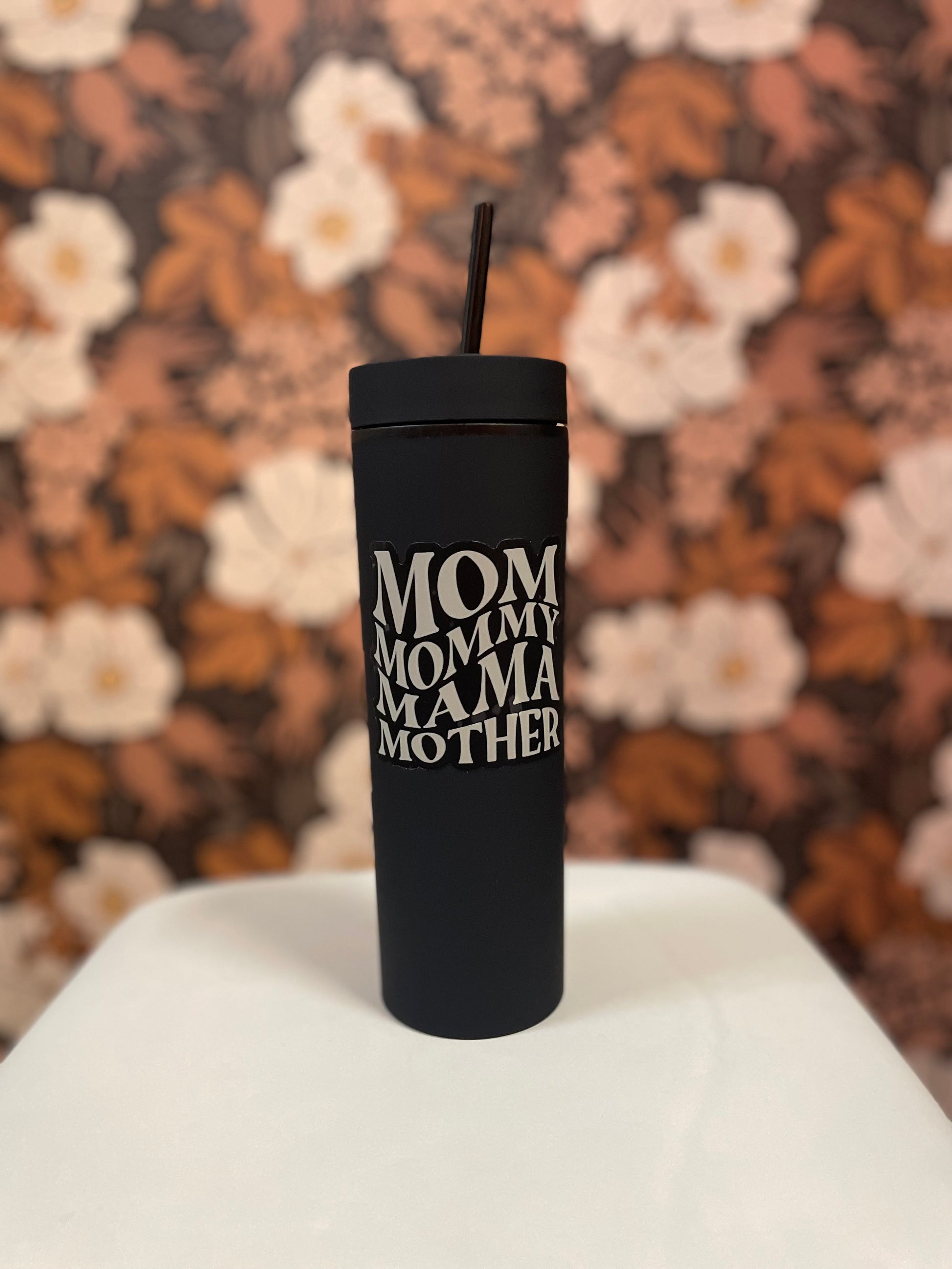 Skinny Tumbler in matte black, comes with a lid, straw, and a Mama sticker attached.