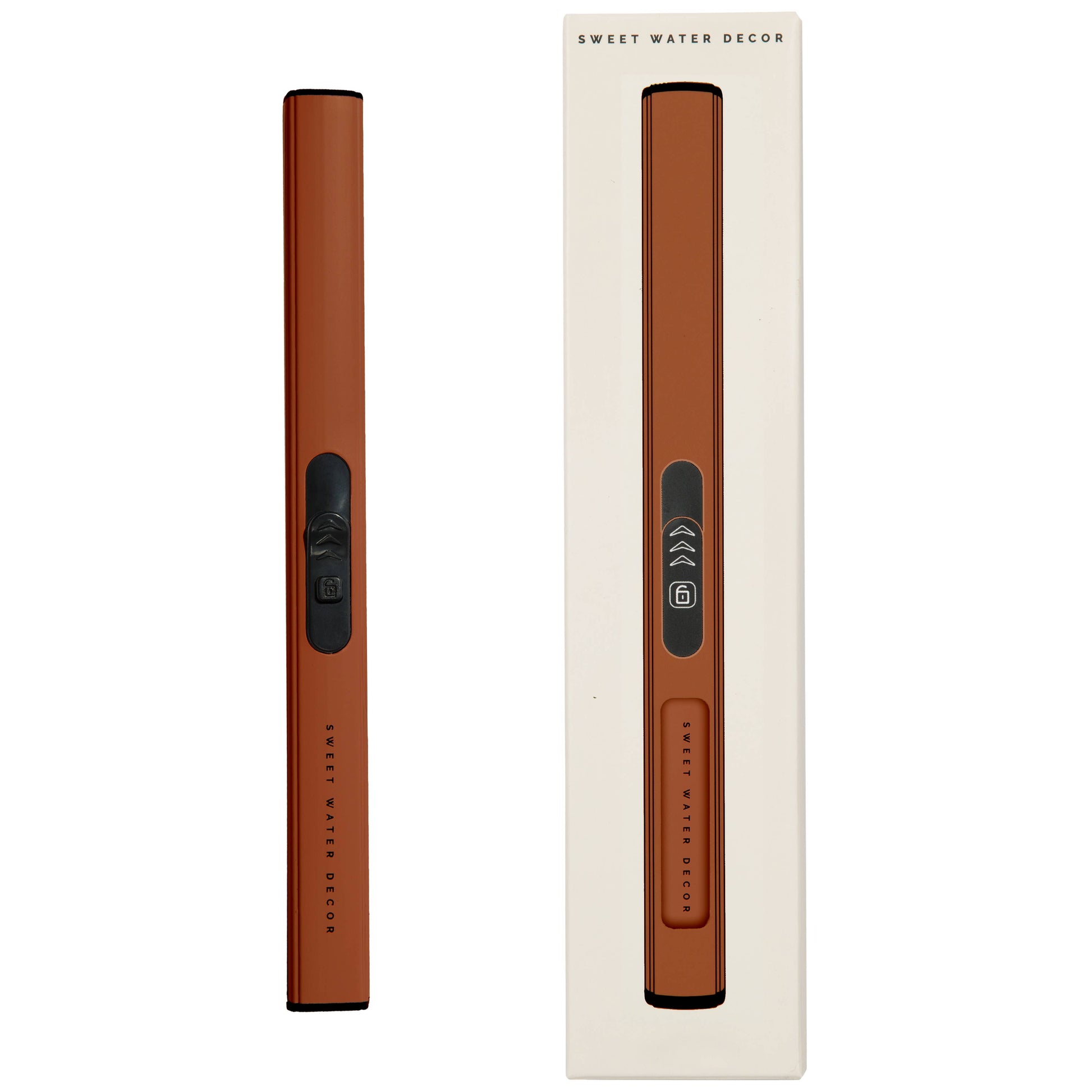 Light up with style and sustainability. This sleek rechargeable electric lighter features a sophisticated burnt orange finish and ultra-thin aluminum alloy design that doubles as a modern home accessory.