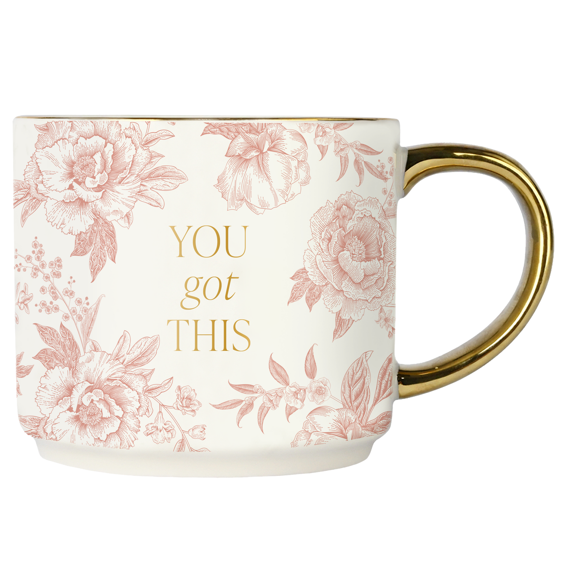 Start your day with a little pep talk. This charming 17oz mug pairs an uplifting "You Got This" message with a delicate pink Delft design that wraps all the way around. Crafted from fine bone china with a gleaming gold handle and accents, it's the perfect pick-me-up for coffee lovers who need a daily dose of encouragement. Hand wash to keep that gold finish looking pristine, and skip the microwave. An ideal gift for anyone tackling big goals or just getting through the week.
