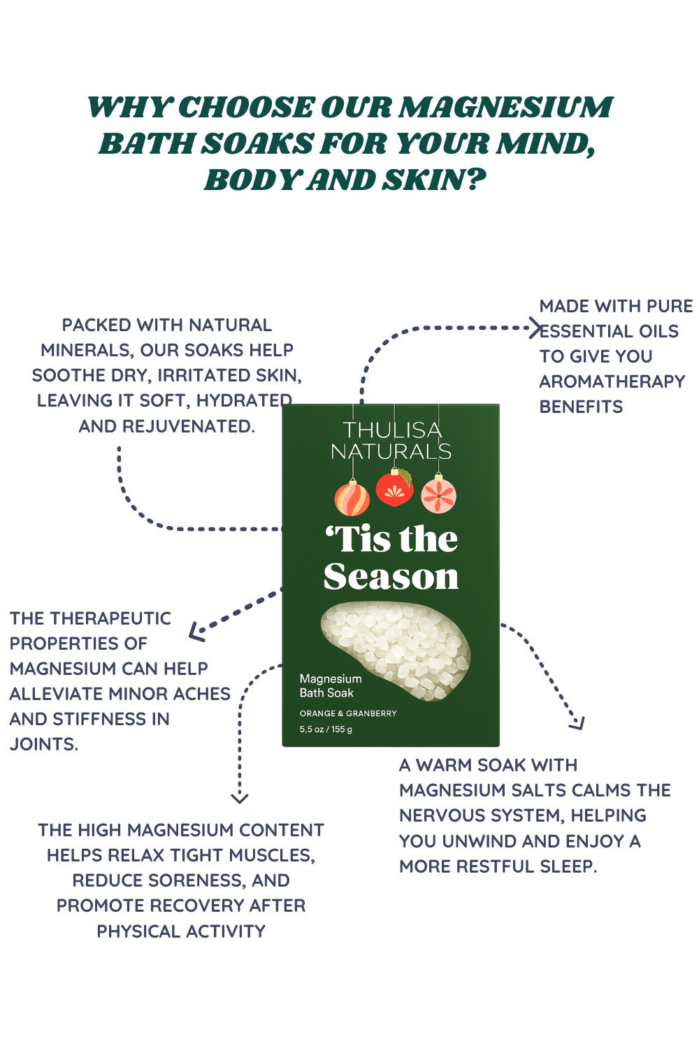 Introducing the ultimate holiday soak for spa enthusiasts, relaxation seekers, and anyone who loves pampering. Our 'Tis the Season Spiced Orange-Cranberry Magnesium Bath Soak offers a cozy, rejuvenating self-care escape wrapped in festive comfort. Infused with 100% natural Zechstein magnesium chloride flakes and Mediterranean sea salt, this blend combines warm spiced orange and tart cranberry to help relieve muscle tension, reduce stress, and restore balance during the busy holiday season. Whether you celebrate Christmas, Hanukkah, Kwanzaa, or simply love thoughtful gifting, this soak is the perfect stocking stuffer or spa-inspired present. • Made in the USA with clean, natural ingredients • Recyclable and compostable packaging • Certified cruelty-free by Leaping Bunny • Great for gift boxes, hostess gifts, white elephant, and travel • A portion of proceeds helps feed preschoolers in South Africa